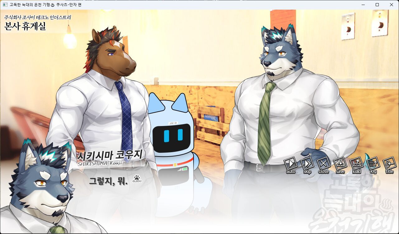 앞서 말했듯 ”온천 기행“ 시리즈는 도쿄의 한 Ai 로봇 제조 업체에서 근무하는 수컷 늑대 수인 시키시마 코우지가 온천 여행을 떠나며 여러 사람과 만나고, 그 과정에서 벌어지는 이야기를 그린 성인용 작품이다. 주인공 시키시마는 덩치에 맞지 않게 수동적인 인물로 그려지며, 그래서 여행 과정에서 늘 누군가의 도움을 받는다. 온천 기행 1편의 또 다른 주인공은 같은 회사 직속 후배인 말 수인 이타쿠라 켄토다. 둘은 잦은 야근으로 지쳐 남은 연차를 빨리 쓰라는 압박을 받고, 평소 여행을 좋아하던 이타쿠라는 선배 시키시마에게 연차를 함께 쓰고 피로도 풀 겸 온천 여행을 가자고 제안한다. 그렇게 향한 곳이 이타쿠라의 고향이자 일본에서 유명한 온천 관광지 중 하나인 ”쿠사츠 온천“이다.